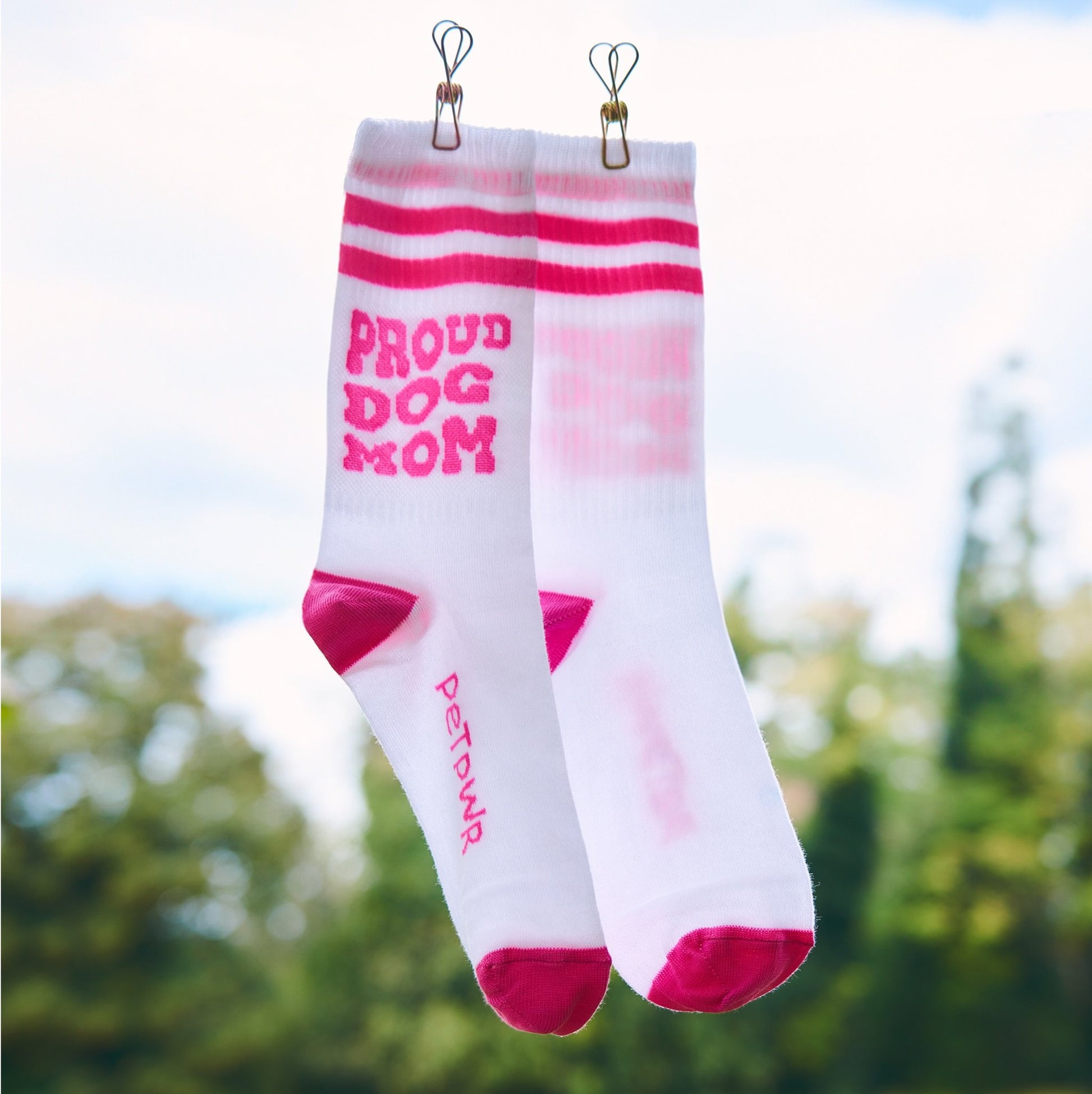 Calzini modello sportivo totalmente Made in Italy con scritta "Proud dog mom". Calzino bianco, scritta viola o rosa.