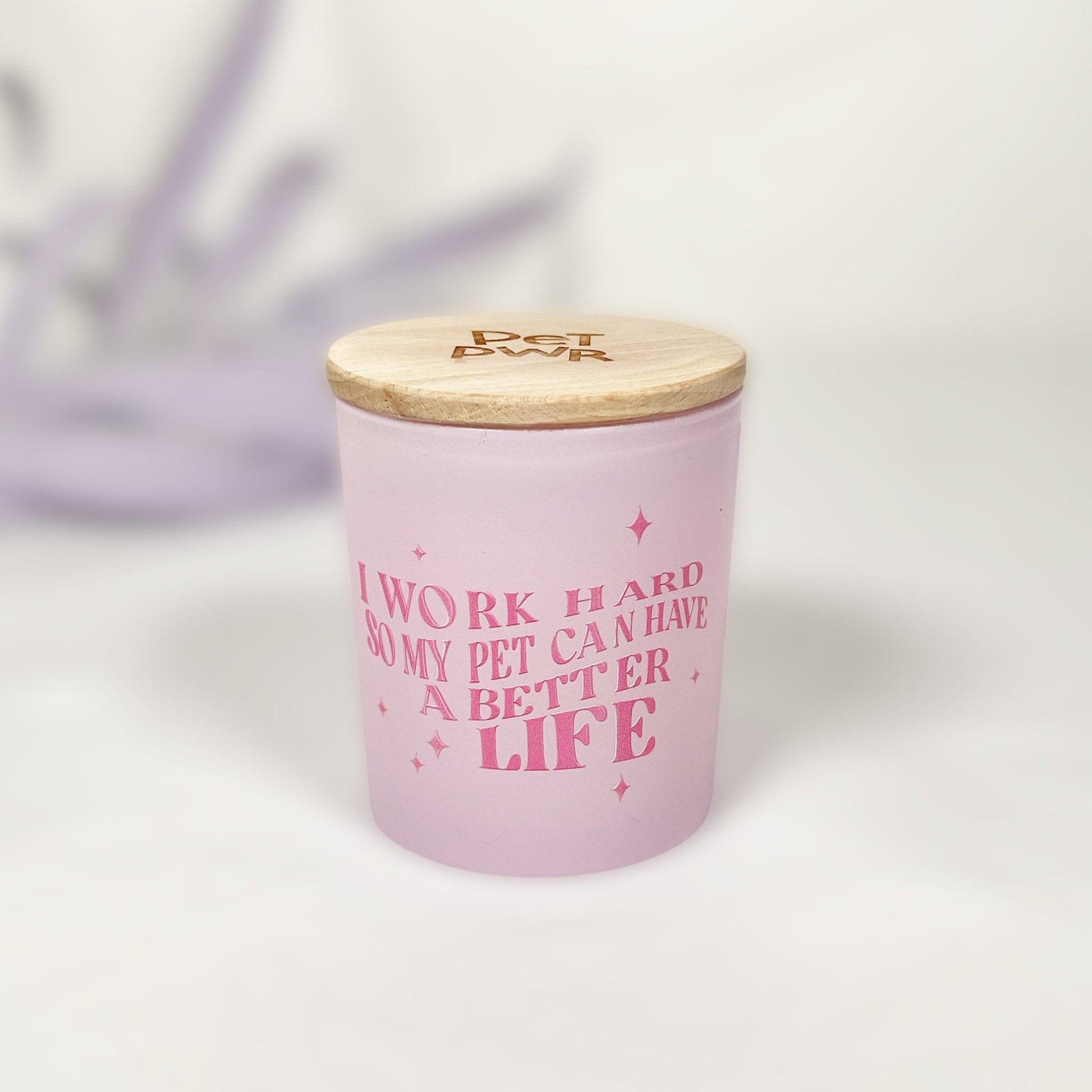 Candelaย lilla con scritta rosa "I work hard so my pet can have a better life",ย fragranza alla lavanda.