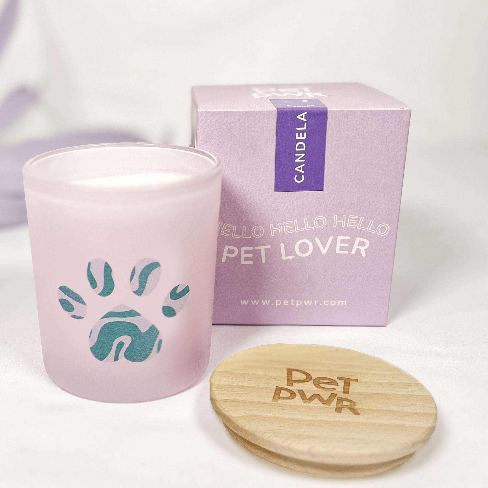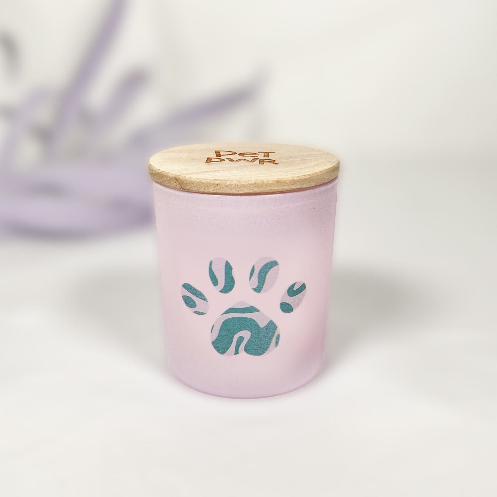 Candela lilla con zampa pattern verde, fragranza alla lavanda.